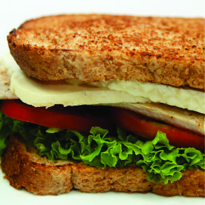 Pain brun, fromage, filet de poulet, laitue, tomate, chips.
